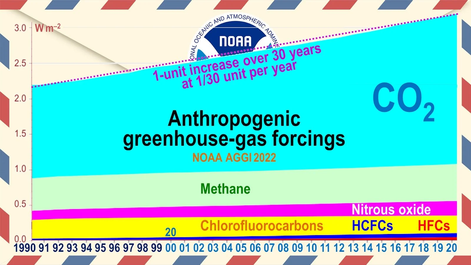 annual greenhouse-gas index (below) shows that, in the 30 years 1990-2020, the influence of all nations on global temperature has grown in a straight line by just 1 unit, at